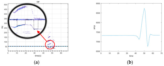 We also took actual field trials and reproduced the simulated circumstances. The car passed the sensor at a speed of 5 km/h, and the CPA distance between the vehicle and the sensor was 5 m. Through trials, we proved that the approach can successfully identify the power frequency magnetic anomaly disturbance signal induced by the presence of the target. The phenomenon is that the extracted wavelet energy ridge anomaly is the same as the occurrence time of the target calibrated by the geomagnetic sensor, or in other words, the fluxgate sensor receiving the geomagnetic signal is deployed in the same position as the inductive magnetic sensor receiving the alternating magnetic signal.