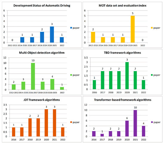 We eventually acquired 98 research publications by applying the inclusion and exclusion criteria outlined in the previous section. The study goals and research questions listed in Section 2.2 are addressed in these research articles. We categorize these papers into six categories based on our analysis of their application fields and algorithm structures: “autonomous driving development status,” “multi-object tracking dataset,” “multi-object detection algorithm,” “TBD framework algorithm,” “JDT framework algorithm,” and “Transformer-based tracking framework algorithm” (all research papers use deep learning methods and only use monocular camera sensors). Histograms are used in Figure 2 below to illustrate the data extraction and categorization process.