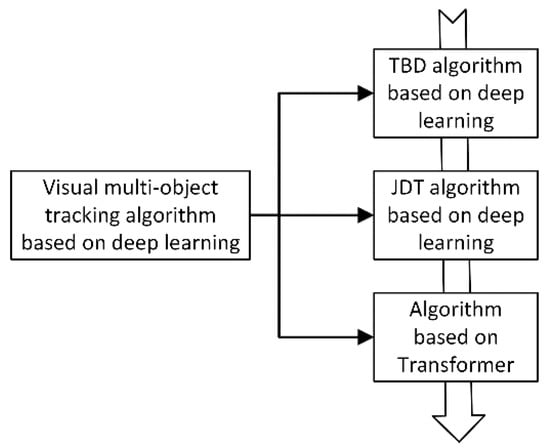 Classification and algorithm of visual multi-object tracking based on deep learning. Overall, the development trend of visual multi-object tracking algorithm is from TBD, to JDT, to Transformer-based tracking algorithm.