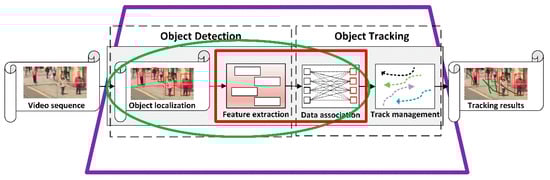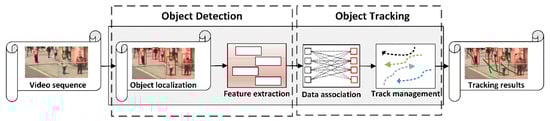 The main procedures of TBD framework, which consists of four core components. The four core components contain object localization, feature extraction, data association, and track management. (Source: This image is from the MOT16 dataset [25]).