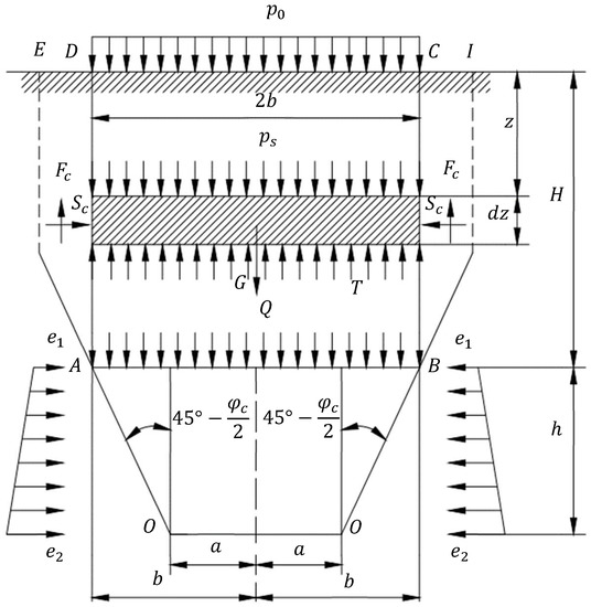 Based on the principle of stress transmission, Terzaghi’s theory [39] believes that the wall rock pressure acting on temporary support equipment comes from the stress transmission of the self-weight of the overlying soil, and the size of the wall rock pressure depends on such factors as the self-weight of the soil in the loose area and the internal friction angle of the rock mass [40]. In this theory, the differential element body is taken in the sliding block for the stress analysis, and the maximum wall rock pressure of the roadway is calculated. The calculation model is shown in Figure 3.