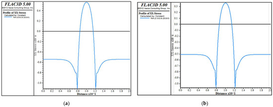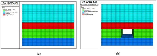 The size of the elastic–plastic area and stress concentration area during roadway excavation is affected by factors such as the roadway section size, burial depth, and mechanical properties of coal and rock. Combined with the geological data of the 7900 mining area of a mine, FLAC 3D was used to build the roadway wall rock support system model, as shown in Figure 4, wherein (a) is the initial model of wall rock and (b) is the model of roadway after excavation. The length of the model was 20 m, the width was 9 m, and the height was 16 m. The shape of the roadway section was rectangular, and the section size was 4.5 × 3.5 m, with a section area of 15.75 ; it was composed of four layers of siltstone, coal seam, silty sandstone, and medium fine sandstone from bottom to top. The definition of its geological data is shown in Table 2.