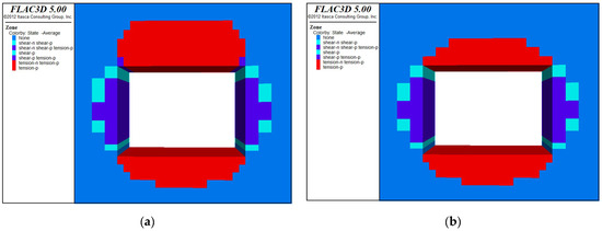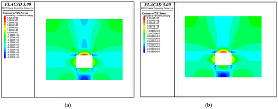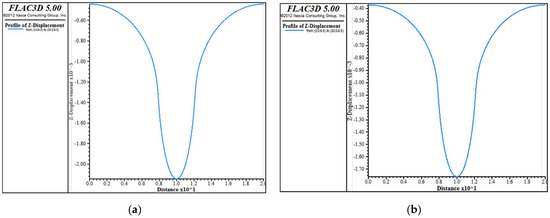 We ran FLAC 3D to conduct a numerical simulation on the roadway wall rock model established above, and we analyzed the displacement, stress, and plastic failure characteristics of the roadway roof before and after the temporary support equipment support according to the operation results. The support force required for the roadway roof was calculated in Section 3.1. Here, we added this support force to the lower surface of the roadway roof to replace the actual support. In this process, the influence of support stiffness on the roof was ignored.