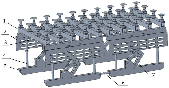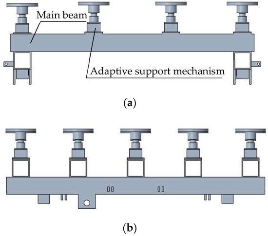 In recent years, many scholars have applied the FEA method to analyze the mechanical properties of various forms of temporary support equipment. Ren [29] carried out an FEA on the key load-bearing parts of the support, obtained the stress and strain distribution characteristics and vibration characteristics of the roof beam and base, checked the strength and stiffness of the key parts, and solved the resonance between the equipment and the roadheader. Lu [30] carried out a mechanical and modal analysis on the roof beam, base, and retaining wall of temporary support equipment of an arch roadway and obtained the strain and stress characteristics of key parts under the maximum wall rock pressure. Zhang [31] carried out an FEA on the overall structure and key bearing components of a temporary support under different working conditions according to industry standards. Li [32] carried out an FEA on the temporary support equipment under the roof fall condition of a rectangular roadway through ANSYS Workbench and verified that it met the support requirements. Yang [19] carried out an FEA on the roof beam and base of an inchworm-type tunnel temporary support and studied the stress and strain characteristics of the roof beam under normal working conditions and the most dangerous working conditions. Liu [23] verified the rationality of structural stiffness and strength through a static analysis, modal analysis, and dynamic response analysis of a single group of supports and a push mechanism.