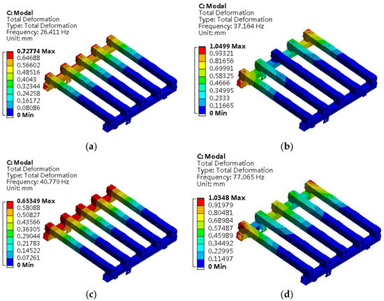 The performance parameters of the main beam before and after optimization are shown in Table 15. After optimization, the quality and maximum equivalent stress of the main beam were reduced, and other properties were also optimized, which showed that the overall performance of the main beam was improved and verified the rationality of the structural optimization of the main beam.