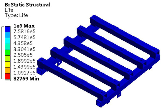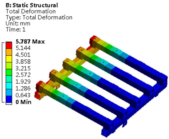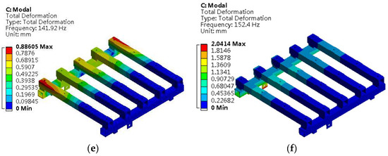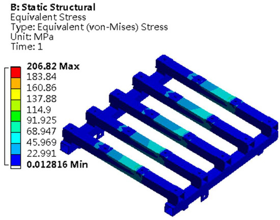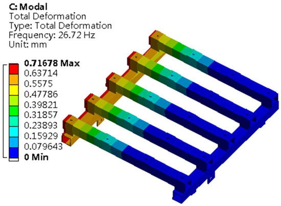 According to the values of the design variables in Table 14, the main beam was simulated and analyzed under the condition of a lateral eccentric loading. The optimized stress nephogram, deformation nephogram, fatigue life nephogram, and first-order natural frequency nephogram are shown in Figure 33, Figure 34, Figure 35 and Figure 36, respectively. By comparing Figure 18d, Figure 19a, and Figure 20 before optimization, it can be seen that after optimization, the maximum stress of the main beam decreased to 206.82 MPa, the maximum deformation decreased to 5.78 mm, the first natural frequency was adjusted to 26.72 Hz, and the fatigue life increased to 82769 times. Through measurement, it can be seen that the mass of the main beam decreased to 8419.1 kg.
