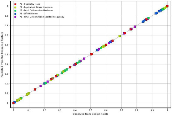 It can be seen from the above response surface diagram that with the increase of P3 and P4, the weight of the main beam increased, the maximum deformation decreased, the maximum stress decreased, the first natural frequency increased, and the fatigue life increased. The influence of the above design variables on the objective function provided a basis for the subsequent correction of the design variables and determination of the optimal design scheme.