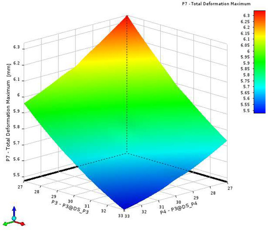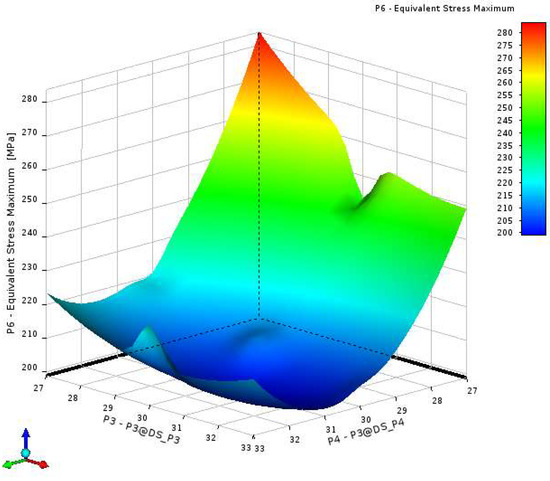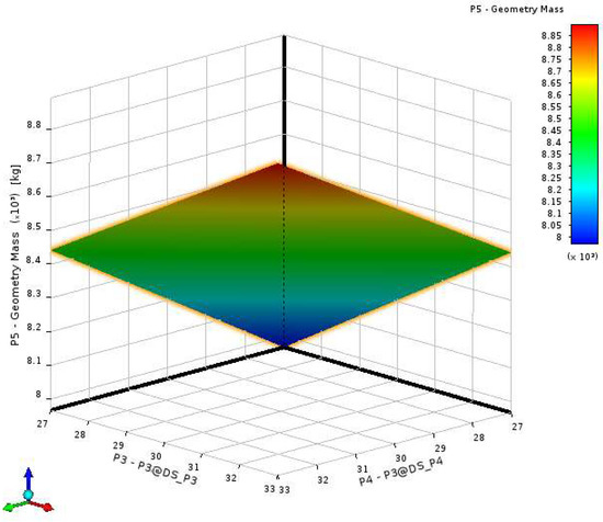 The response surface graph can directly reflect the influence of design variables on the objective function. According to the response surface graph, the influence of the design variables on the objective function can be determined, and the response surface graph can be obtained through the multiobjective optimization module of ANSYS Workbench. Taking the design variables P3 and P4 of the main beam as an example, the response surface of P3 and P4 to the mass, maximum deformation, maximum stress, first-order natural frequency, and fatigue life of the main beam were obtained, as shown in Figure 28, Figure 29, Figure 30, Figure 31 and Figure 32, respectively.