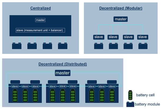 A BMS aims to measure different parameters of a battery, such as cell- and module voltages or currents, as well as temperatures. In addition, the BMS calculates different quantities such as SOC, SOL, SOP and SOH [7]. Furthermore, it measures the charging and discharging current of a battery, using shunts, Hall or/and fluxgate sensors. The purpose of a BMS is to keep the battery operating in a safe, reliable and efficient way in every operating state [8]. For this, the BMS consists of different modules, actors and sensors. In general, there are three different BMS architectures in BEVs and HEVs. One of them is the centralized architecture, which collects and processes the measurements on a single module over one channel connection to each battery module. There is also a decentralized architecture, which can be separated into a modular and a distributed sub-architecture. The modular architecture consists of several slave modules and a master module, which communicates via CAN or a wireless connection. While the slave modules measure voltages, currents and temperatures at each battery module, the master module collects the overall measurements of each measurement module and processes the different states out of them. Finally, the distributed architectures are also built out of a main computing unit (master) and several measurement units (slaves). Different from the modular architecture, it has one slave for each battery cell. This is why this topology often becomes more expensive than the others [29,30,31,32]. Figure 2 shows all possible BMS architectures (centralized; decentralized) in general and for overview.