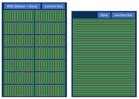 The single slave modules calculate the measured voltages and temperatures. Because the measurement physics need resistors to determine the values, the slave modules need to have a small control unit. In today’s conventional EV batteries with smaller cells, e.g., 21,700, and a modular design an overall sum of around 7000 cells, makes a complex slave module arrangement necessary. The upcoming cell-to-pack design with 30–40 cells enables a more centralized slave module design, see Figure 5. It is then conceivable to connect all cells of a battery with only one slave module. A direct connection to the PD is not expedient due to the then numerous cable connections through the temperature (often 4-wire measurement) and voltage measurement. With prismatic cells in a cell-to-pack design, a high level of the integration of cells, slave module and junction box is possible. For this reason, the design saves installation space or enables high ranges through better utilization of space and thus a high energy density of the battery. The junction box contains components that are sensibly located in the immediate vicinity of the HV-lines of the battery in order to avoid electrical hazards. The positioning of the slave module is more flexible. The BMS’s computing unit can be put on one controlling unit (e.g., PD), where the different measurements of the slave modules are post processed.