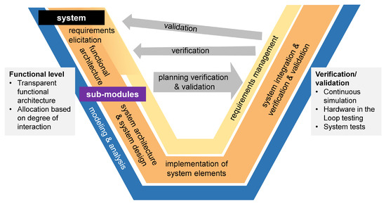 The synthesis of E/E-architectures needs to be integrated in the overall product development processes. In the automotive industry, currently the model-based systems engineering (MBSE) [41] is employed for achieving efficient digital processes with connected product and process models [42]. The processes constitute the development life-cycle of the technical system and are usually represented in the form of a V-model—such models are, for instance, described in the guideline VDI/VDE 2206 [43]. The V-model is a graphical representation of the logical sequence of process steps [44]. Several essential elements in this sequence concern the functional domain (compare [45,46], i.e., models of the technical system, which describe the intended functionality. The functional domain is located on the upper left side of the V (Figure 6—based on the guideline VDI/VDE 2206 [43]).
