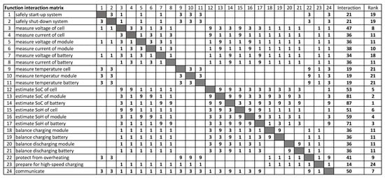 Additional functions would be the estimations of the state of life (SoF) and the state of available power (SoP) as well as a protection of over- and under voltage and the early prediction of thermal runaways. Figure 7 presents the main functions, which were analyzed concerning their mutual interaction in the form of a function interaction matrix.