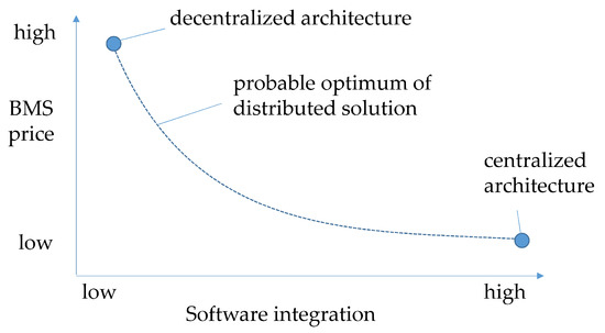 Visible in Figure 8 are the two ends of the solution continuum. One is a completely centralized solution, with only one central processing unit and all sensors directly connected to the central processing unit. The other end is a completely decentralised solution, within which all sensors are connected to slave units in the direct surroundings and all processing is conducted by a large network of slaves; a central processing unit does not even exist. The synthesized solutions will be a compromise between these extremes, and the best of them will probably achieve characteristics that are on the line of the probable optimum, as visible in Figure 8. It can be concluded that a centralised solution is desirable for, amongst others, economic reasons. A centralised E/E-architecture of the BMS can only be sensibly achieved if both hardware and software functions are realised in central entities. This kind of software integration will pose additional challenges on the product development process and will require a methodological procedure style according to the V-model and continuous simulation and HiL-tests (see also Figure 6).