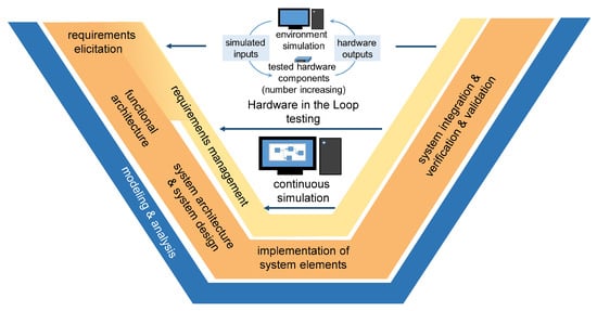One of the cornerstones of successful product development is a transparent representation and a conscious occupation with the functional domain, which requires an integrated consideration [45]. Very important are also verification and validation processes. It is important to note that both verification, i.e., evaluating whether the BMS meets the given requirements, and validation, i.e., evaluating whether the requirements correctly and entirely captures the customer’s expectations, are essential. An important role in verification processes plays so-called HiL testing, i.e., a combination of real and virtual components in a simulation. Such verification processes should be conducted continuously—this leads together with complete system tests to an evolutionary development process (compare Section 2.4).