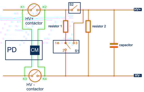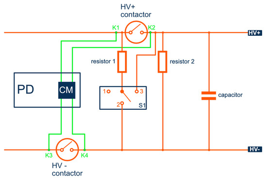 Furthermore, to protect the battery system against an overcharge and over discharge current, the BMS needs to switch the high voltage (HV) contactors and therefore to communicate to the junction box of an EV. Most EVs do have two of these HV contactors, one at the HV+ and one on the HV− side of the battery pack. In addition to protect the HV-system immediately after a crash, a pyro-fuse disconnects the circuit triggered by a crash sensor. At the ignition of the system, the HV-capacitor gets charged over a in-line pre-charge resistor to avoid high inrush currents. Another circuit is there to discharge the HV-capacitor when the HV-system is shut-down. Normally, the HV-capacitor is actively discharged over a small value resistor and a transistor (IGBT). In case this system is subject to an error, there is an additional large resistor in parallel to the HV-capacitor to make sure it can be discharged in every scenario in a passive way. This is an example of an existing redundancy in the electrical circuit of a HV-system to increase its safety. If the HV-capacitor is not discharged, electrical accidents can occur when working on the HV-system due to voltages above 60 V.