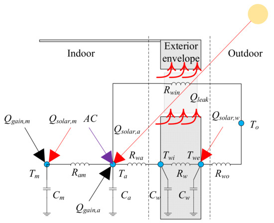 In order to link the indoor temperature change with the user energy consumption scheduling, a residential ETP model is established, which consists of the outdoor part, the exterior wall and the indoor part, as seen in Figure 2. There are three main modes of heat transfer in the model: heat conduction, heat convection and heat radiation. The outer wall is equivalent to a thermal resistance and two thermal capacitances, which are denoted as R and C, respectively. For the external surface of the wall, it obtains the heat gain from solar radiation, obtains heat from the inside of the wall, and transfers heat to the outdoor air by convection. Equation (1) depicts the change rate of the exterior wall temperature Twe, which is related to heat transfer. Similarly, Equation (2) depicts the change rate of the internal wall surface temperature Twi, which is influenced by both indoor air convection and wall conduction heat transfer. Equation (3) gives the energy balance equation of indoor air. Indoor air has a certain heat storage capacity, and it exchanges heat with internal mass, the air outside walls and windows. In the model, indoor air also absorbs heat gain from solar radiation, internal heat gain and heat generated by IAC, but will leak heat due to the gap at the junction. Equation (4) gives the energy balance equation of internal mass. The internal mass such as room partitions and furniture have large thermal inertia, and their equivalent heat capacity Cm can maintain the slow change of mass temperature Tm. In addition to the heat exchange with indoor air, the internal mass absorbs the solar radiation heat gain and internal heat gain, which are denoted as and . Equations (5)–(7) are the expressions of solar heat gain absorbed by exterior walls, internal mass and indoor air, respectively. Equation (8) is the heat loss. Equations (9) and (10) represent the absorption of internal heat gain by mass and air respectively. Equation (11) represents three sources of internal heat gain: household appliances, lighting and human body heat radiation.