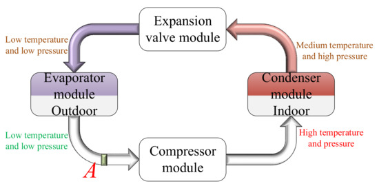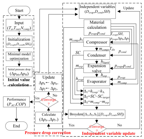 Figure 4 shows the numerical calculation flow of the system, which is mainly divided into four parts: initial value calculation, independent variable update, pressure drop correction and performance parameter calculation. The operating condition parameters include the indoor air temperature Ta, the outdoor temperature Tout and the rotor speed Ncomp of the inverter compressor. The model first solves the independent variables in the minimal model as the initial value of the iteration. Secondly, the Broyden algorithm is used to solve the independent variable iteratively to make the residual close to zero, and the pressure drop at the high pressure side ΔPh+, and low pressure side Δpl- are calculated when converged. The pressure drop is introduced into the compressor model, and the pressure drop and independent variables are updated iteratively under this condition. The iteration stops when the pressure drop difference is less than the threshold. Finally, the performance parameters are calculated. As shown in Equations (16) and (17), the power consumption of IAC is mainly related to the compressor, condenser fan and evaporator fan. At the same time, the electric energy consumed by the condenser fan is eventually converted into the internal energy of the indoor air. Therefore, in addition to the heat release of the condenser, the numerator of COP also contains the internal energy.
