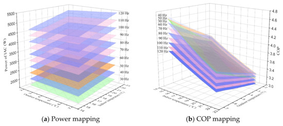 Accurate house thermal models [19] and air conditioning models have a significant impact on the conditioning effect. In terms of air conditioning, constant frequency air conditioning has been gradually replaced by inverter air conditioning (IAC). The performance of IAC is related to the indoor/outdoor temperature and the compressor speed, and its steady-state model can be used to study the coupled dynamic characteristics of the room and IAC. Research and experiments on steady-state models are abundant [20,21,22], but their computation time is unacceptable for scheduling problems. In [16,23], the performance map based on the steady-state model was obtained for the direct control of IAC.