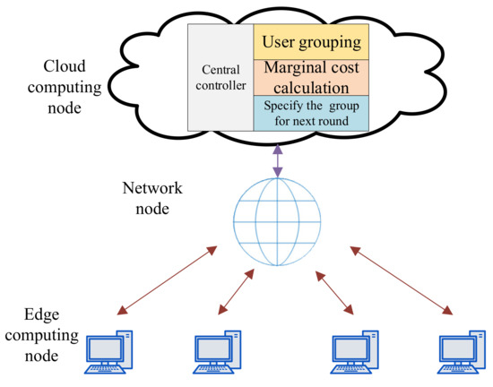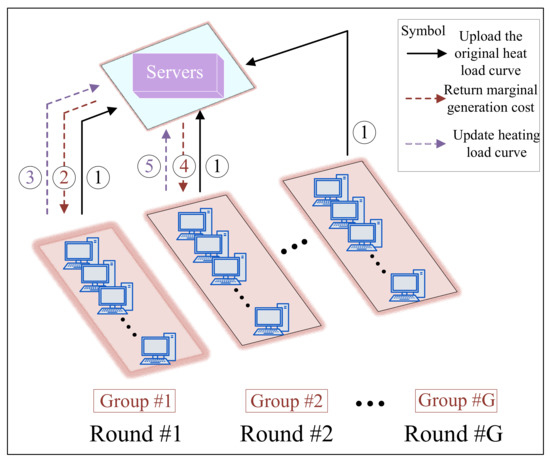 As shown in Figure 6, each household acts as an edge computing unit to solve the demand response problems (18)–(20) according to the received marginal electricity price. The central controller is the key to coordinate all groups, which contains three functional modules: user grouping, marginal cost calculation and specifying scheduling group. According to the central controller, the user adjusts the heat load planning based on the updated marginal cost. And in each round of adjustment, only a small number of users participate in scheduling so that the marginal cost will not be significantly changed.