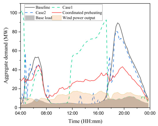 The simulation will be implemented within the time range of 04:00~24:00. In order to comprehensively analyze the performance of the coordinated preheating algorithm, this paper compares several cases, and the results are shown in Figure 8. The gray area in the figure represents the base load, and the yellow area represents the wind power output. The base load is not adjustable. The black solid line is the baseline heating schedule, in which all users set heating schedules by on-off mode according to the set temperature. The solid red line is the result of coordinated preheating. It can be seen that the curve is smoother than the baseline because part of the peak load is shifted to the valley. And the red solid line is almost all above the yellow area, so the wind power consumption is greatly promoted. Another two cases were analyzed to demonstrate the superiority of the coordinated preheating strategy. In case 1, all households schedule their heat load curves based on the baseline electricity price to reduce the energy bill on the premise of meeting the temperature demand. The baseline electricity price curve is the marginal generation cost curve in the baseline case. It can be seen that in case 1, a forward and higher peak is formed due to the neglect of marginal cost change, which leads to excessive preheating and heat loss instead. Therefore, concentrated scheduling in the absence of coordination will lead to preheating failure and increase the cost of power generation. To further illustrate the necessity of coordination, case 2 is used for comparison. In case 2, all households schedule their heat load curves based on the marginal cost curve of the coordinated preheating case, which can be regarded as the optimal electricity price curve. However, it also failed to reduce the peak, indicating that the scheduling based on a single price curve is not feasible and the coordination is necessary.
