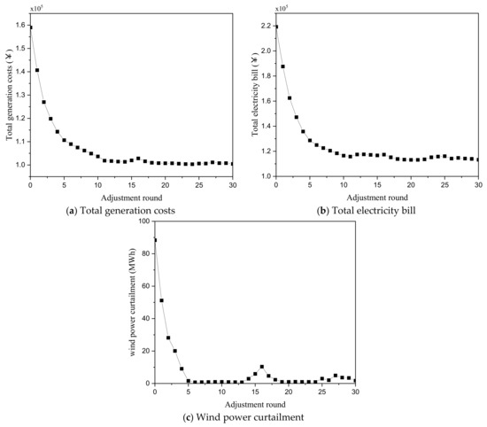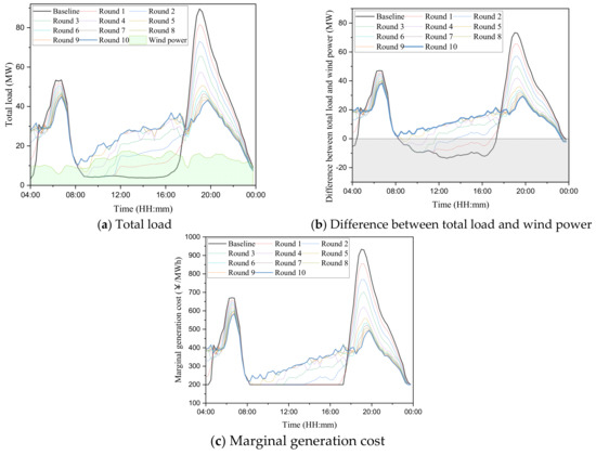 In order to analyze the impact of each round of adjustment on the system, the important process curves are given in Figure 10, and their meanings have been marked in the figure. It can be seen from Figure 10a that both the morning and evening peaks of the total load decrease with the adjustment. The peak decreases more obviously in the first few rounds, and gradually approaches the balance in the later rounds. It is worth noting that compared with the morning peak, the evening peak has dropped more significantly. This is because the preheating period before the evening peak is long and there is no specific heat demand (the user has not yet arrived home), so the adjustable range is large. The preheating period before the morning peak has strict temperature restrictions (to ensure a proper sleep temperature), and the adjustment range is limited. In addition, since the earlier the preheating is, the greater the heat loss will be, the preheating period will not be too long. The gray part in Figure 10b represents the wind power curtailment area, and it can be seen that the curve gradually leaves the area with adjustment. Figure 10c shows the change process of the marginal cost curve, which becomes smoother with adjustment.