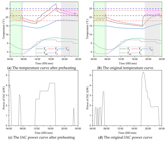 Figure 11b is the original temperature curve, and Figure 11d is the corresponding IAC power curve. It can be seen that the black solid line representing the indoor air temperature is located at the bottom of the orange and blue areas, which both meet the user’s temperature demands and save energy. From 04:00 to 07:15, the user was sleeping, so the IAC adjusts the power to ensure that the temperature does not exceed the lower limit. The power is increased around 07:00 to ensure a comfortable temperature when the user wakes up. After the user leaves home, the IAC stops running, so and starts to drop. decreases more slowly than because the heat capacity of internal mass is larger than that of air. At this time, the internal mass transfers heat to the air. As the temperature difference between and gradually decreases, the heat loss becomes smaller, so the temperature drops faster first and then slower. The IAC power starts to rise at about 18:15 to ensure a comfortable temperature when users get home. As the air heat capacity is small, rises rapidly. And due to the large temperature difference between the air and internal mass, the air begins to transfer a lot of heat to internal mass until temperature is close to temperature . In addition, as the temperature demand decreases during sleep, although the IAC power drops to zero at 23:15, the temperature still meets the demands when the user sleeps (around 23:30).