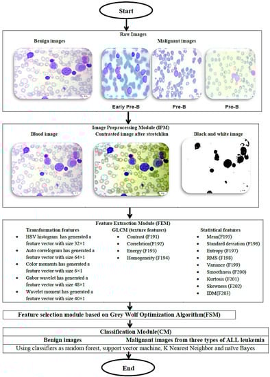 The flowchart of the proposed methodology is illustrated in Figure 3. The methodology begins with receiving the raw images of the blood cells. Then, the images pass through four modules: (1) image preprocessing module (IPM) stage which is responsible for the preprocessing of the blood cells’ images for enhancing the image contrast, resolution, etc., (2) feature extraction module (FEM) for extracting the descriptive features of the images, (3) applying the grey wolf optimization algorithm for selecting the most important feature that can describe the blood cell’s histology, and (4) using different classification modules (CM) to classify the blood cells into benign or malignant status. The four modules are described in detail in the following sections.