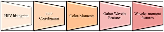 In general, the image has three central moments of color distribution. They can be expressed as the mean, the standard deviation, and the skewness. A color is defined by three or more values; in the proposed methodology, it can be expressed as the HSV scheme of hue, saturation, and brightness. Therefore, the image is defined by nine moments, three moments for each of the three color channels. The ith color channel at the jth image pixel is denoted as pij. The average color value in the image is represented by the mean (E), the standard deviation (σ) which is the square root of the distribution’s variance, and skewness (S) which is a metric for deciding the level of asymmetry in distribution [17,18].
