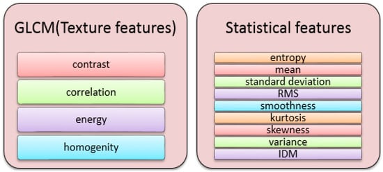 In addition to the GLCM features, the statistical features can be described as [24,25,26]: