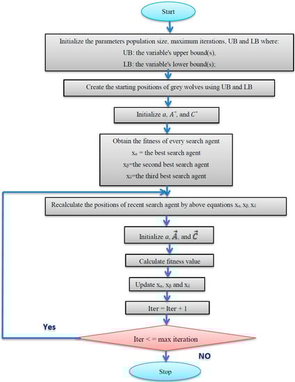 The grey wolf optimization algorithm is a straightforward optimization algorithm that draws inspiration from nature and uses its leadership structure to find the ideal answer to a given problem [29,30,31]. Figure 6 depicts the grey wolves’ social (or leadership) structure. It consists of four adjusting parameters as: