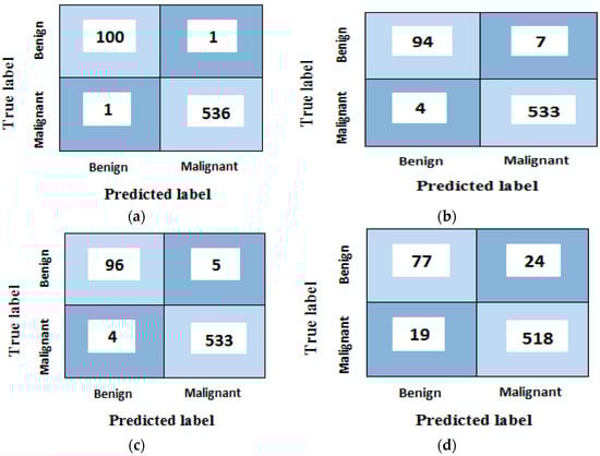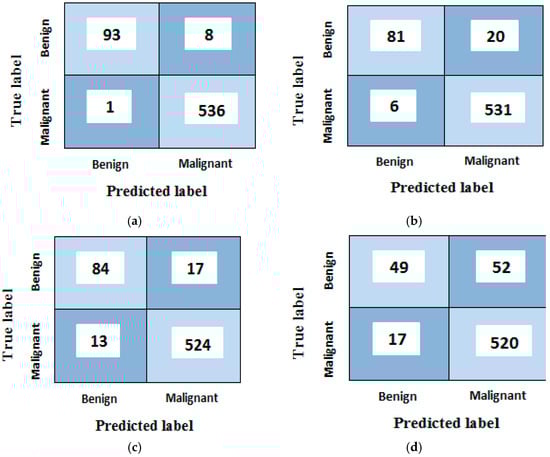 Figure 12a shows that (93) images are correctly recognized, whereas (8) benign samples are recognized as malignant type (false positive). It also discloses that (536) malignant samples are rightly classified, whereas only (1) samples are improperly classified as benign type (false negative). Corresponding results are found for the rest of the confusion matrices b, c, and d.