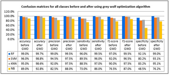 As shown in Figure 14, ALL detection before using the grey wolf optimization algorithm was able to achieve an average sensitivity of 96%, specificity of 92.1%, accuracy of 99%, F1-score of 97%, and precision of 99% when applying RF. In addition, it was able to achieve an average sensitivity of 89.5%, specificity of 80.2%, accuracy of 96%, F1-score of 92%, and precision of 94.5% when applying the SVM classifier. We were able to obtain an average sensitivity of 88.5%, specificity of 83.2%, accuracy of 95%, F1-score of 90%, and precision of 92% when applying the KNN classifier. When we applied the NB classifier, we reached an average sensitivity of 73%, specificity of 48.5%, the accuracy of 89%, F1-score of 76.5%, and precision of 82.5%.