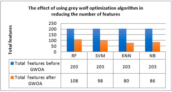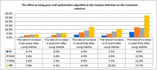 After using the grey wolf algorithm in features selection, it was found that the rate of increase in accuracy became 0.7% in RF, 2.8% in SVM, 3.6% in KNN, and 3.8% in NB. The rate of increase in precision became 0.5% after using RF, 3%, 5.5%, and 5.5% after using SVM, KNN, and NB, respectively. Sensitivity also increased after using the grey wolf technique and became 3.5%, 6.5%, 8.5%, and 13% of RF, SVM, KNN, and NB, respectively. The rate of increase in specificity became 6.9%, 12.9%, 11.9%, and 27.7% when using RF, SVM, KNN, and NB, respectively.