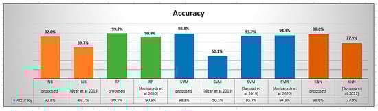A comparative result between the proposed and the other techniques in the literature was performed. Additionally, we compared machine learning algorithms SVM, NB, KNN, and RF algorithms for the binary classification. Table 6 shows different study results.