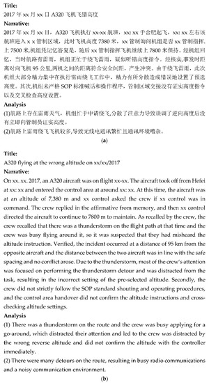 All incident reports of this study were written in Chinese, with an average word count of dozens to hundreds, while most have only one narrative. In Figure 1, we present an example of a complete aviation accident report consisting of a title, narrative, and analysis. In this example, the title documents the type of incident (incorrect altitude), aircraft type (A320), and time (2017). The narrative documents the pilot’s distraction resulting in incorrect altitude settings. The narrative and analysis documented a lack of cross-checking, operational violations, inclement weather (thunderstorms), and poor communication between pilots and traffic controllers that contributed to the incident.