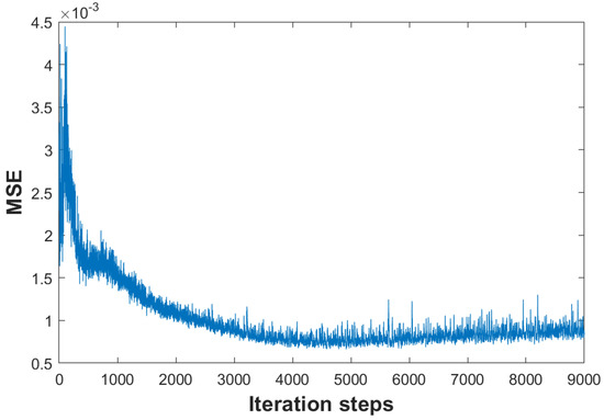 DIP shows that the unsupervised DNN is capable of capturing low-level image statistics. However, given the same network input and learning target, DIP cannot generate identical denoised images owing to the randomly initialized network weights. To illustrate its uncertainty, we compared two denoised images generated from the DIP optimization processes. Figure 2 shows the variations in mean square error (MSE) between the network outputs of the two DIP optimization processes as the number of DIP iterations increases. In the two DIP learning procedures, we used the same noisy image as the learning target and the same random noisy image as the input. We can see from Figure 2 that MSEs show a downward trend before 4000 iterations, whereas MSEs remain to after 4000 iterations. It is apparent that different DIP optimization processes generate different denoising results. It is impossible to obtain the same network output at the same iteration steps, even when given the same network input z and the same learning target. To investigate the detailed difference between the denoised images generated from different DIP learning processes, we conducted experiments on noisy images, as shown in Figure 3. The PSNR of the two instances generated from DIP is 27.40 and 27.43 dB, respectively. Although the PSNR of the two denoised instances is similar, the contents of these instances are different. To measure the reconstruction error (RE) r, we calculated the difference between the denoised instance and clean image c with respect to the pixel