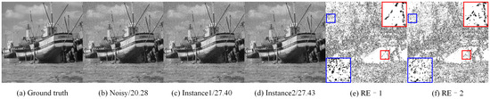 Figure 3 shows a visual comparison of two denoised instances generated from two DIP optimization processes with the same network input and the same target noisy image. As shown in Figure 3c,d, the two denoised instances are similar. However, from Figure 3e,f, there are evident differences between the two denoised instances. In Figure 3e,f, we also zoom in on two regions for a better view. Clearly, the blue rectangle of RE–1 contains more black points () than that in the blue rectangle of RE–2, whereas the black points in the red rectangle of RE–1 are fewer than those in RE–2. The black points indicate that the pixel at this point in the denoised instance has the same or similar intensity as the pixel at the corresponding position in the clean image. We can conclude that the denoised images generated from the different DIP learning processes are complementary to each other.