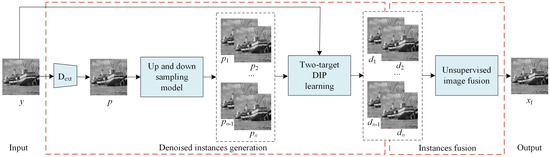 To utilize the diversity and complementation of denoised images generated from DIP to obtain better denoising results, we propose certain preprocessing strategies to generate a set of intermediate denoised instances of the noisy image and then fuse them into the final denoised image. An overall flowchart of the proposed method is shown in Figure 4. As shown in Figure 4, the proposed method comprises two main steps. In the first step, we propose a two-target DIP learning strategy to produce an intermediate denoised image, . Specifically, we first used the given noisy image and preliminary image as the learning targets of the DIP network. Using two targets in DIP learning can constrict the image search space and improve the denoised result. Then, we repeat the two-target DIP optimization process n times with different network inputs and different preliminary images to generate n intermediate denoised images . To generate the preliminary images, the given corrupted image y is fed into a pre-trained denoising model, such as FFDNet, to generate a cleaner image p. Then, we employ an up- and down-sampling strategy to generate diverse sampled images of p. In the second step, we develop an unsupervised image fusion network to fuse intermediate denoised images with a single denoised image . These intermediate denoised images, which have similar image quality and different local details, complement each other. Fusing these into a denoised image can further improve the denoising effect.