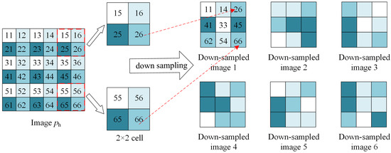 According to the analysis in Section 2, it is important to collect a set of cleaner images such that the denoised instances obtained from the DIP can have diverse reconstruction effects. To this end, we first adopt a pre-trained state-of-the-art image denoising method, FFDNet, to reconstruct the given corrupted image y. FFDNet is one of the best DNN-based denoising models and has obtained remarkable denoising results for real-time noisy images. Clearly, reconstructed image p generated by FFDNet has a higher image quality than y, and using p as the learning target of DIP can achieve a much better denoising effect. However, in the proposed method, we use only p to produce more diverse, cleaner instances. We develop an up- and down-sampling strategy to obtain diverse instances of p. Specifically, we first employ the up-sampling method proposed by [24] to obtain a super-resolution version of p, denoted by . The up-sampler can reshape the input image of size into . Where H and W are the image height and width, respectively, and C denotes the number of channels, that is, for the color image and for the grayscale image. Then, we adopted a randomly selected down-sampler to generate multiple down-sampled instances of . The details of using a randomly selected down-sampler to generate a set of down-sampled images from image are as follows. First, image is divided into cells with size . Here . Subsequently, one location is randomly selected in the -th cell n times. The points corresponding to n locations are taken as the -th point of the down-sampler . For all cells, the random location selection is repeated, n down-sampled images of size are derived. We provide a visual example of generating instances with a randomly selected down-sampler in Figure 5. In Figure 5, image contains pixels and is divided into cells. For each cell, one point was randomly selected to generate a down-sampled image. For example, we select point “26” in the (1,3)-th cell and point "66" in the (3,3)-th cell as the (1,3)-th pixel and the (3,3)-th pixel of down-sampled image 1, respectively. The randomly selected down-sampled process was repeated six times, and six down-sampled images were obtained.
