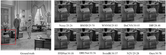 To provide a direct visual comparison of the denoised images, Figure 8 shows the ground truth of a grey image, its noisy image (), and denoised images generated using different methods: BM3D [1], WNNM [3], DnCNN [4], DRUNet [27], DIP [23], FFDNet [5], SwinIR [11], N2V [16], and the proposed method. As shown in Figure 8, our proposed method achieves the best PSNR value on the "Couple" image. By observing the enlarged areas of the recovered images generated by different competing methods, we can see that the denoised images generated by FFDNet, DRUNet, and SwinIR lost some edge information and over-smoothed the image, whereas our proposed method preserved more image details. Visual images of denoising results can be found at https://github.com/chenxiaojun0101/Learning-from-multiple-instances-for-Image-denoising (accessed on 10 September 2022).