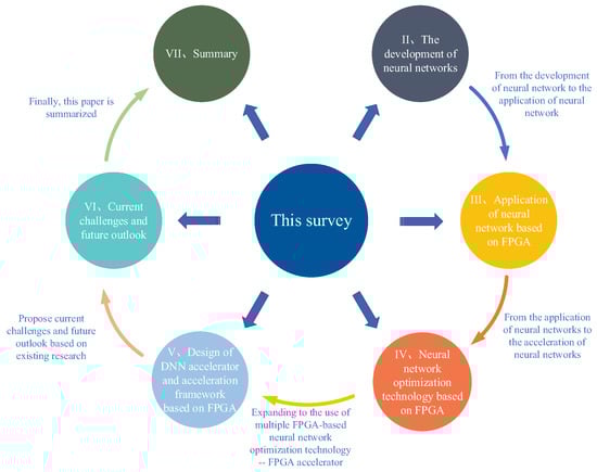 The remainder of this paper is organized as follows: In Section 2, the history of neural networks is clearly shown in the form of a table. The history of neural networks is divided into five stages, being convenient for readers to comb and study. In Section 3, some common neural networks are introduced, and their applications based on FPGA and their effects are described. In Section 4, the acceleration technology of various neural networks based on FPGA is introduced, its advantages and disadvantages and application scenarios are pointed out, and the latest research status and achievements are described. In Section 5, this paper describes the FPGA-based neural network accelerator and the acceleration framework in detail. These accelerators are often the comprehensive application of the acceleration technology described in Section 4, and they are compared with and summarized in terms of the performance of different neural networks deployed on different FPGA platforms using different acceleration technologies. In Section 6, the current difficulties in the application of FPGA-based neural networks are pointed out, and the future research directions are prospected. Finally, the paper is summarized in Section 7. The structural layout of the article is illustrated in Figure 1.