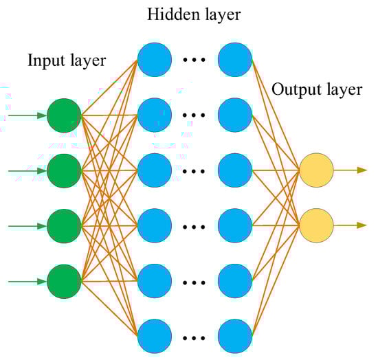 Since a single-layer perceptron cannot solve linear inseparability problems, it cannot be used in industry. Scholars have expanded and improved the perceptron model by increasing the number of hidden layers and corresponding nodes to enhance the expression ability of the model, and thus the deep neural network (DNN) was created. The DNN is sometimes called a multi-layer perceptron (MLP). The emergence of the DNN overcomes the low performance of a single-layer perceptron. According to the position of different layers in the DNN, the neural network layers inside the DNN can be divided into three types: the input layer, hidden layer, and output layer, as shown in Figure 2. Generally speaking, the first layer is the input layer, the last layer is the output layer, and the middle layers are all hidden layers. Layer to layer is fully connected, that is, any neuron in layer n must be connected with any neuron in layer n + 1. Although the DNN appears complicated, from a small local model, it is the same as the perceptron, namely, a linear relation z = ∑Wi Xi + b plus an activation function σ(z).