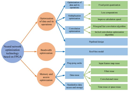 With the rapid development of artificial intelligence, the number of layers and nodes of neural network models is increasing, and the complexity of the models is also increasing. Deep learning and neural networks have put forward more stringent requirements on the computing ability of hardware. On the basis of the advantages of FPGA mentioned in the introduction, increasingly more scholars are choosing to use FPGA to complete the deployment of neural networks. As shown in Figure 6, according to different design concepts and requirements, FPGA-based neural network optimization technology can be roughly divided into optimization for data and operation, optimization for bandwidth, and optimization for memory and access, among others, which are introduced in detail below.