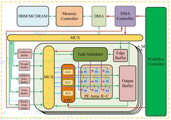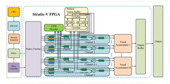 As shown in Figure 7, the architecture uses specialized compressed interleave sparse row (CISR) coding to efficiently process multiple rows of the matrix in parallel, combined with a caching design that eliminates the replication of the buffer carrier and enables larger vectors to be stored on the chip. The design maximizes the bandwidth utilization by organizing the data from memory into parallel channels, which can keep the hardware complexity low while greatly improving the parallelism and speed of data processing.