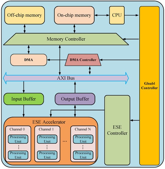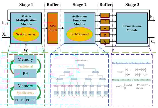 In 2016, the work of J. C. Ferreira and J. Fonseca et al. [54] was considered as one of the earliest works to implement the LSTM network on the FPGA hardware platform, which focused people’s attention from the software implementation of LSTM to FPGA hardware. In 2017, Y. Guan et al. [55] implemented the LSTM network using special hardware IP containing devices such as data scheduler, FPGA, AXI4Lite (one of the Advanced eXtensible Interfaces) bus, and optimized computational performance and communication requirements in order to accelerate inference. In the same year, Y. Zhang et al. conducted two works. First, they proposed an energy-efficient optimization structure based on tiling vector multiplication, binary addition tree, overlap computation, and data access methods [56]. The second further developed on the basis of the first work and improved the performance by adding sparse LSTM layers that occupy less resources [57]. Song Han et al. [58] proposed the ESE (efficient speech recognition engine), a sparse LSTM efficient speech recognition engine based on FPGA, which uses a load-balancing sensing pruning method. The proposed method can compress the size of the LSTM model by a factor of 20 (10 times pruning, 2 times quantization) with negligible loss of prediction accuracy. They also proposed a scheduler that encodes and partitions the compression model into multiple parallel PE and schedule complex LSTM data streams. Compared with the peak performance of the uncompressed LSTM model of 2.52 GOPS (Giga Operations Per Second), the ESE engine reached the peak performance of 282 GOPS on a Xilinx XCKU060 FPGA with 200 MHz operating frequency. ESE, evaluated in the LSTM speech recognition benchmark, was 43 and 3 times faster than the Intel Core I7 5930K CPU and Pascal Titan X GPU implementations, respectively, and was 40 and 11.5 times more energy efficient, respectively.