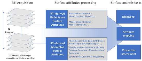 Mastering the functional properties of manufactured surfaces is a major scientific and industrial challenge for a wide variety of applications [1]. The functional properties of surfaces cover a large spectrum. A non-exhaustive list includes tribological properties [2,3], properties associated with material mechanics [4], wettability [5], biological properties, and functional parameters linked to light–surface interaction. This approach induces many issues and scientific challenges, in particular, the choice of measurement technology, the choice of the scale for both measurement and analysis tasks, and the choice of filtering and post-treatment methods. In this context, the RTI imaging method is currently experiencing significant growth [4,6,7] and is positioned as a complement to conventional techniques in industry, which are often based on 3D microscopy for the measurement of surface roughness.
