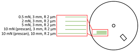 In order to illustrate the proposed methodology, we apply it to an application surface associated with the watch industry, specifically, a watch dial with a precious material deposit and a polished finish. Manufactured micro-scratches in known locations and with different geometric characteristics were made on the surface with a scratch test machine (Anton Paar ). The characteristics of this sample are shown in Figure 3. The acquisitions were carried out with a custom device consisting of a monochromatic two-thirds active pixel-type CMOS sensor with a resolution of 12.4 MPix () and a white uniform light (high power LED). In terms of RTI acquisition modalities, 149 angular positions distributed homogeneously in the angular space () were acquired, with an exposure time of 125 ms.