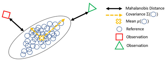 In order to identify and evaluate surface anomalies in the context of appearance quality control, it is necessary to be able to compare the points of the surface with each other using an objective criterion. A point is an anomaly when its behavior is different from its neighborhood or from the sought function. As the comparison cannot be absolute, only relative, this amounts to calculating distances between surface points. The distance, called the saliency in the case of intra-surface distances, is estimated from a multivariate analysis of the descriptors of the observed pixel descriptors Y relative to the average values of descriptors of the reference pixels X associated with the neighborhood under consideration. The method chosen here is based on the Mahalanobis distance [34], as illustrated in Figure 4, and is described in Equation (1) below: