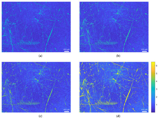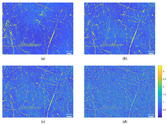 In this part, we propose to extend the use of the Mahalanobis distance to both the pixels and to the RTI acquisitions themselves. Thus, we no longer compare the appearance attributes of the points of a surface, only the surface states between them. The comparison of surfaces allows detection of changes in the surface state, helps to observe and prevent anomalies, and enables exploration of the surface state manufacturing parameters in order to approach a reference surface appearance. To compare several surfaces with each other, a distance must be estimated between the local descriptors of the reference surface and the surfaces studied by the Mahalanobis method. When using Equation (1), X then corresponds to the local descriptors of the reference surface and Y corresponds to the local descriptors of the surface for which we want to know the distance. If we have several surfaces to compare with a reference, we obtain several salience maps which discriminate the local changes with an intensity correlated to the degree of change with respect to the reference. Thus, as illustrated in Figure 13, several nickel surfaces can be observed. These surface states have an average roughness () and a maximum roughness (), provided by the manufacturer, that are different for each sample. Then, it can be seen in Figure 14 that the Mahalanobis distance between the surfaces is correlated with the difference of and between the surface reference and the studied surface. To validate these results, an additional study should be conducted to determine the reflectance measurement error and the appropriate normal estimation method [36,37].