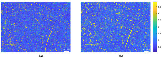 In Section 2.2, we noted that with multi-level saliency the level of salience of the points decreases when similar points are taken as references. However, by decreasing the size of the sliding window when estimating multi-scale salience, in Section 2.3 we increased the proportionality of the observed and reference salient points when inside the sliding window, thus decreasing the level of salience. We then avoided this drop in the level of salience by coupling the multi-scale method (Equation (4)) to the multi-level method (Equation (3)), as described in Equation (6). It can be observed in Figure 12 that small surfaces anomalies are always visible thanks to the multi-scale approach, while the salience dynamics are increased thanks to the multi-level approach. Thus, the coupling of the two approaches makes it possible to reconcile the discrimination of smaller defects while keeping a large dynamic, which, for example, allows them to be classified and synthetic values of salience to be extracted, thereby integrating the aspects of scale.
